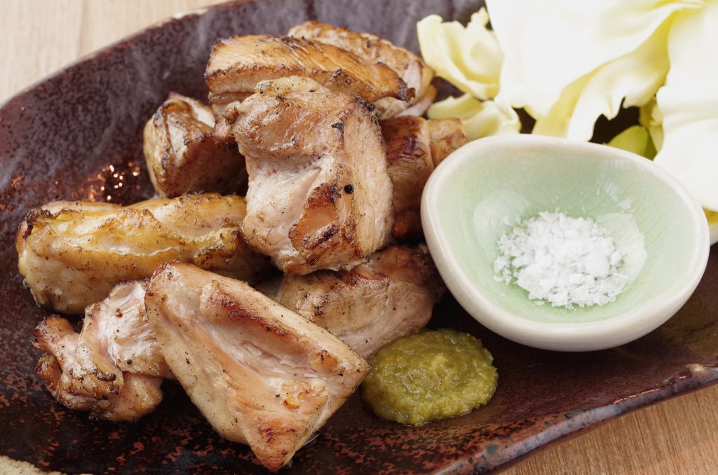 名物の仙台牛たんをはじめ牛・豚・鶏の炭火焼きメニューも揃っています。写真は柚子胡椒でさっぱりとおめしあがりいたく鶏のせせり焼き。炭火の香りをまとったお肉たちは絶品です